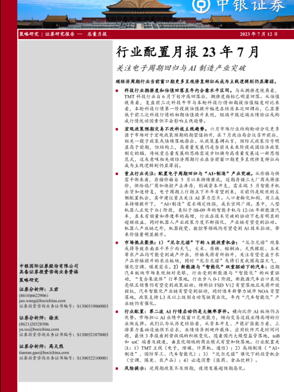 【中银证券】【20230712】行业配置月报23年7月:关注电子周期回归与AI制造产业突破-30页 行业研究