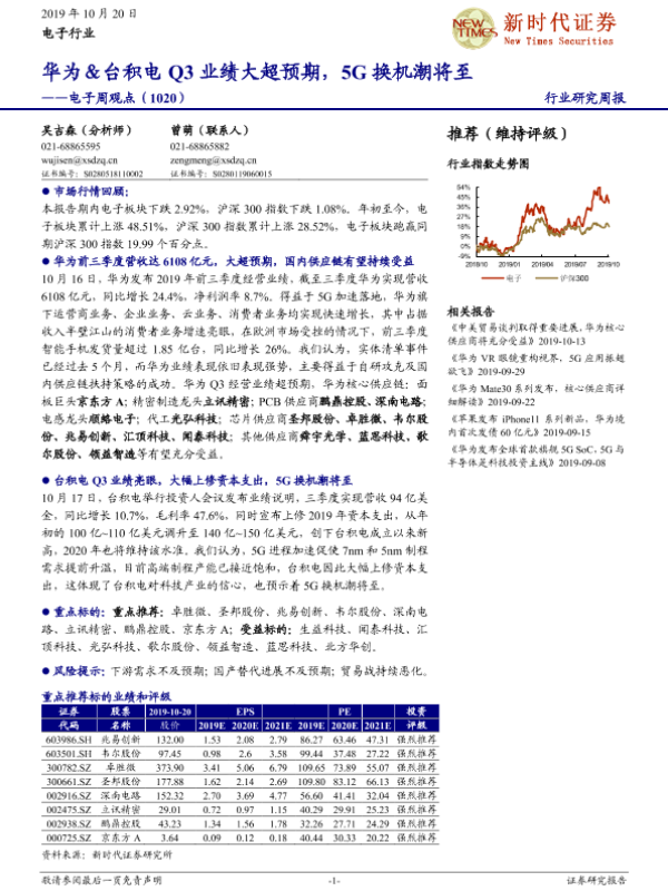 【新时代证券】【20191020】电子周观点:华为&台积电Q3业绩大超预期,5G换机潮将至-17页 行业研究