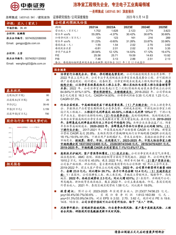 【中泰证券】【20230514】20230514-中泰证券-圣晖集成-603163.SH-深度报告:洁净室工程领先企业,专注电子工业高端领域-39页 行业研究