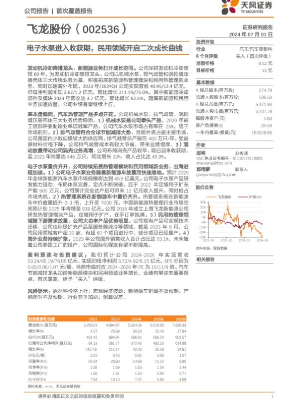 【天风证券】【20240701】飞龙股份(002536)电子水泵进入收获期,民用领域开启二次成长曲线-29页 行业研究