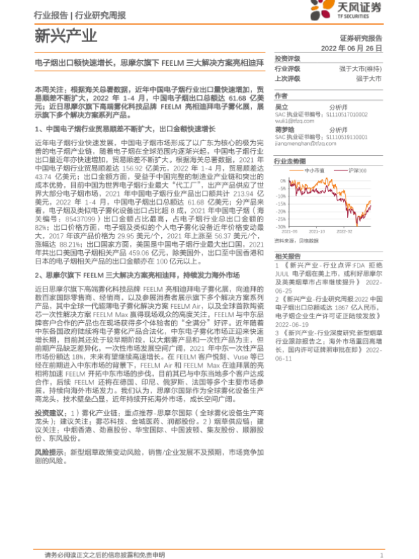 【天风证券】【20220626】新兴产业行业研究周报:电子烟出口额快速增长,思摩尔旗下FEELM三大解决方案亮相迪拜-4页 行业研究