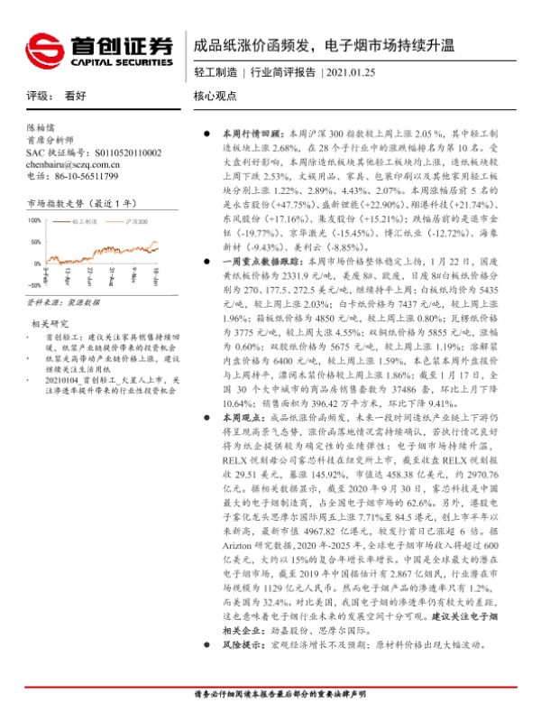【首创证券】【20210125】20210125-首创证券-轻工制造行业简评报告:成品纸涨价函频发,电子烟市场持续升温-12页 行业研究
