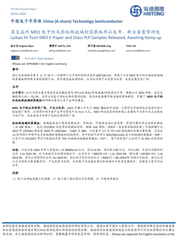 【海通国际】【20250204】中国电子半导体:莱宝高科MED电子纸及面板级玻璃封装载板样品发布,新业务蓄势待发-19页 行业研究