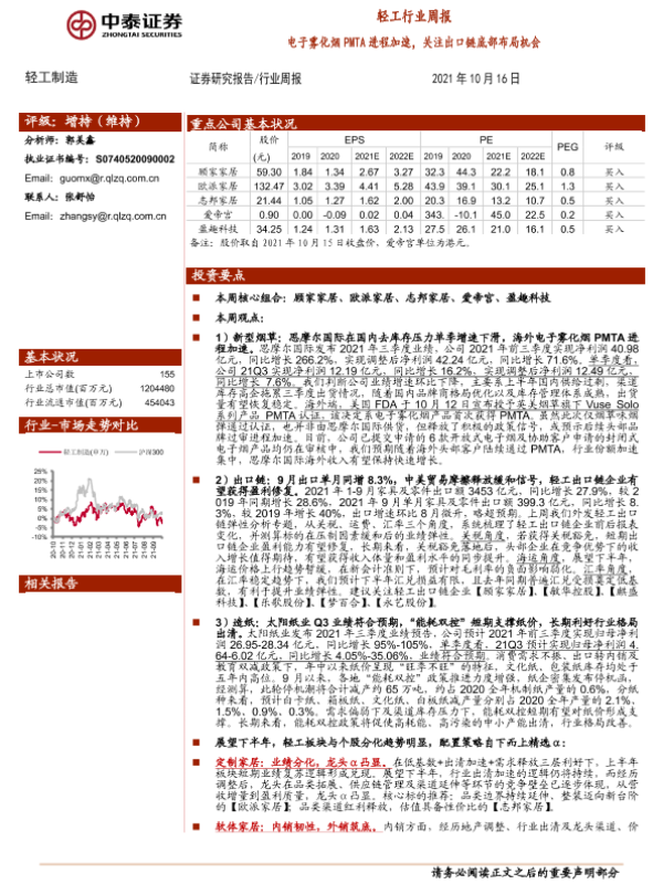 【中泰证券】【20211016】轻工行业周报:电子雾化烟PMTA进程加速,关注出口链底部布局机会-16页 行业研究