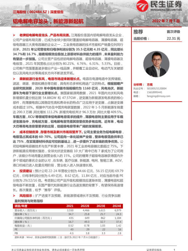 【民生证券】【20220707】江海股份(002484.SZ)深度报告:铝电解电容龙头,新能源新起航-24页 行业研究