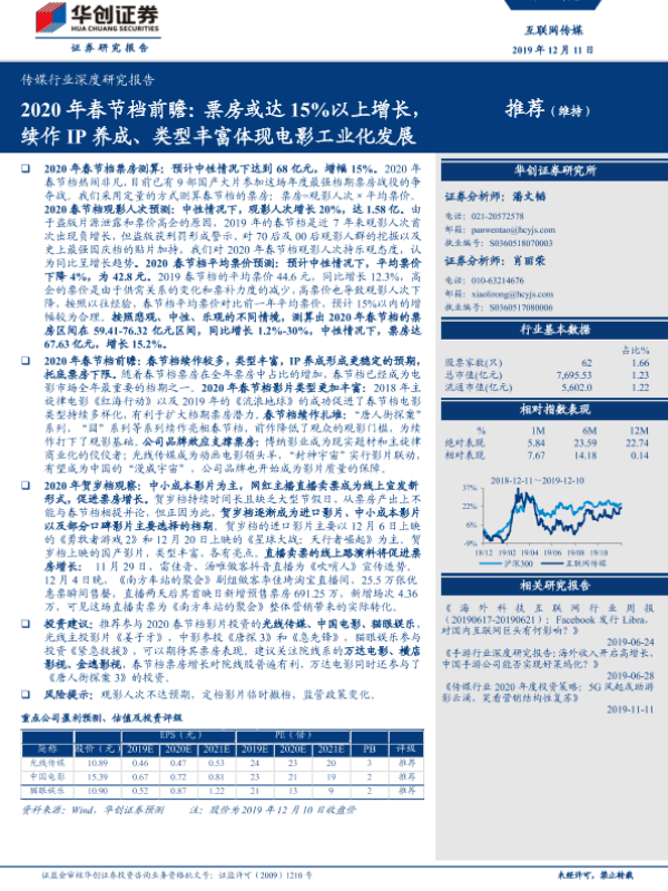 【华创证券】【20191211】2020年春节档前瞻:票房或达15%以上增长,续作IP养成、类型丰富体现电影工业化发展-19页 行业研究