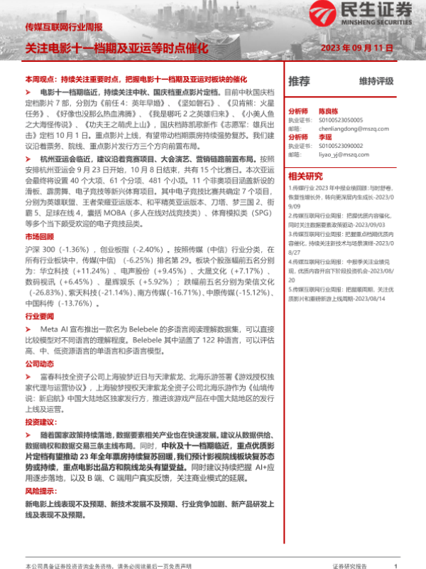 【民生证券】【20230911】传媒互联网行业周报:关注电影十一档期及亚运等时点催化-17页 行业研究
