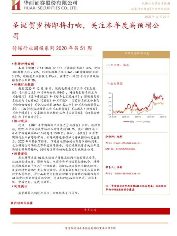 【华西证券】【20201220】20201220-华西证券-传媒行业周报系列2020年第51周:圣诞贺岁档即将打响,关注本年度高预增公司-15页 行业研究