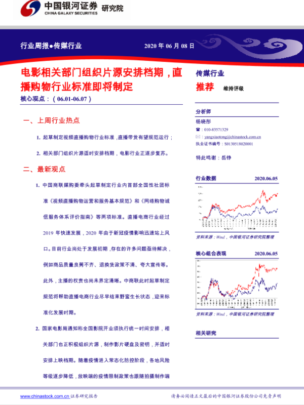 【银河证券】【20200608】20200608-中国银河-传媒行业周报:电影相关部门组织片源安排档期,直播购物行业标准即将制定-36页 行业研究