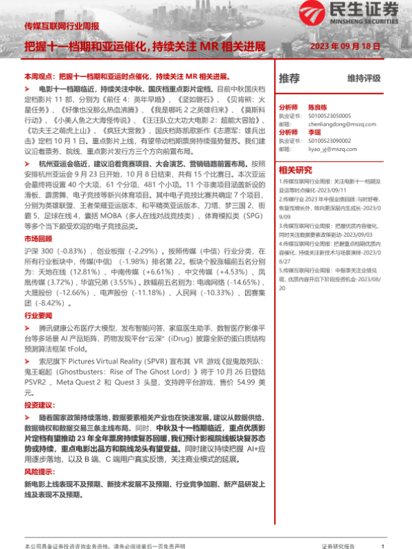 【民生证券】【20230918】传媒互联网行业周报:把握十一档期和亚运催化,持续关注MR相关进展-17页 行业研究