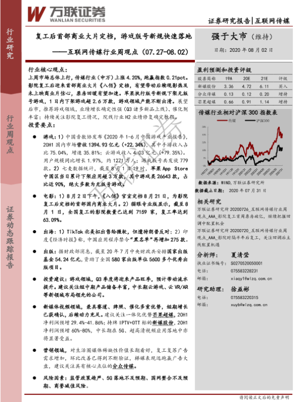 【万联证券】【20200802】互联网传媒行业周观点:复工后首部商业大片定档,游戏版号新规快速落地-13页 行业研究