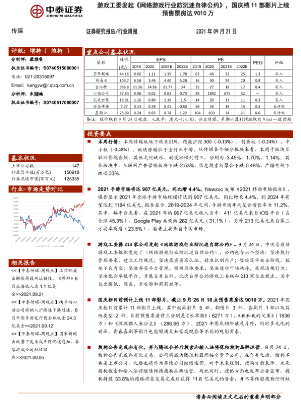【中泰证券】【20210921】中泰证券-传媒行业周报:游戏工委发起《网络游戏行业防沉迷自律公约》,国庆档11部影片上线预售票房达9010万-12页 行业研究