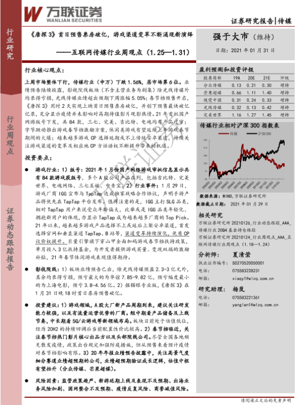 【万联证券】【20210131】互联网传媒行业周观点:《唐探3》首日预售票房破亿,游戏渠道变革不断涌现新演绎-20页 行业研究