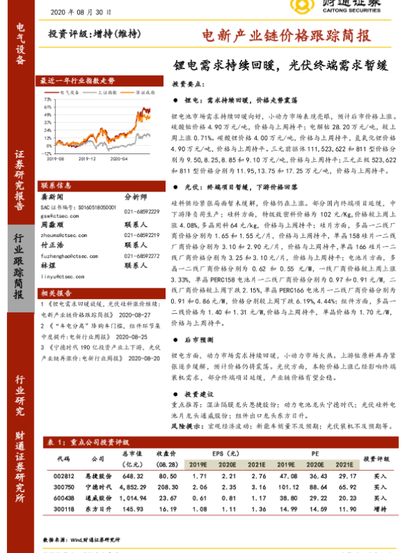 【财通证券】【20200809】20200809-财通证券-电新产业链价格跟踪简报:锂电需求持续恢复,光伏价格涨幅收窄-10页 行业研究