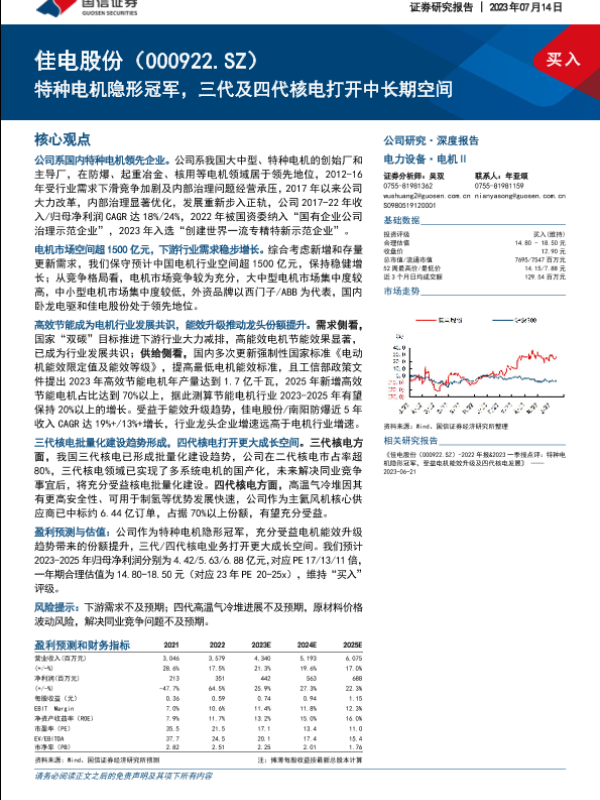 【国信证券】【20230714】佳电股份(000922)特种电机隐形冠军,三代及四代核电打开中长期空间-43页 行业研究