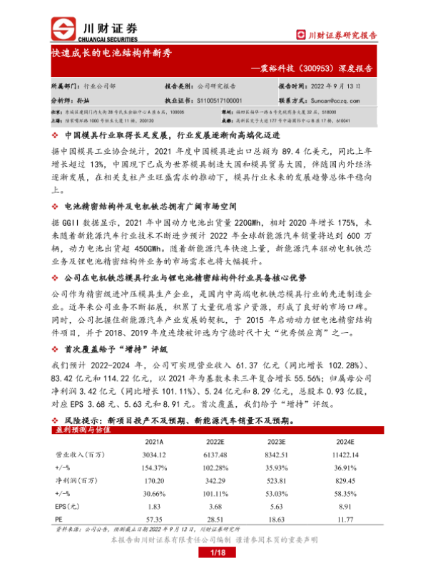 【川财证券】【20220913】快速成长的电池结构件新秀:震裕科技(300953.SZ)深度报告-18页 行业研究