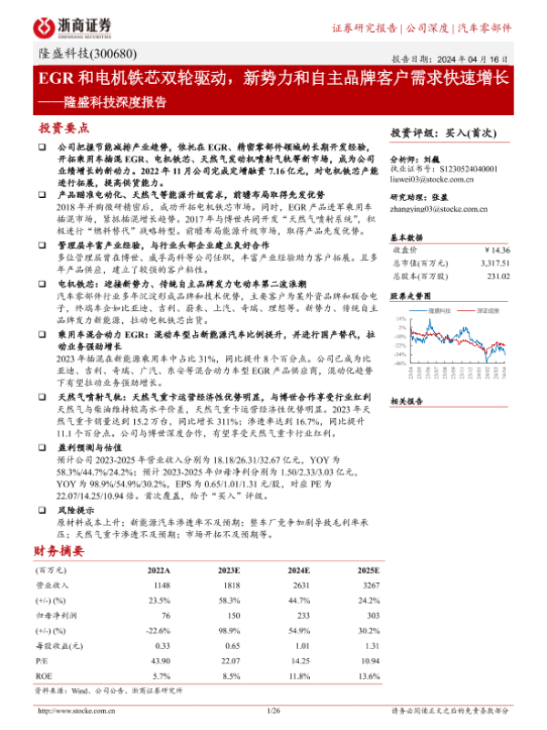【浙商证券】【20240416】隆盛科技深度报告:EGR和电机铁芯双轮驱动,新势力和自主品牌客户需求快速增长-26页 行业研究