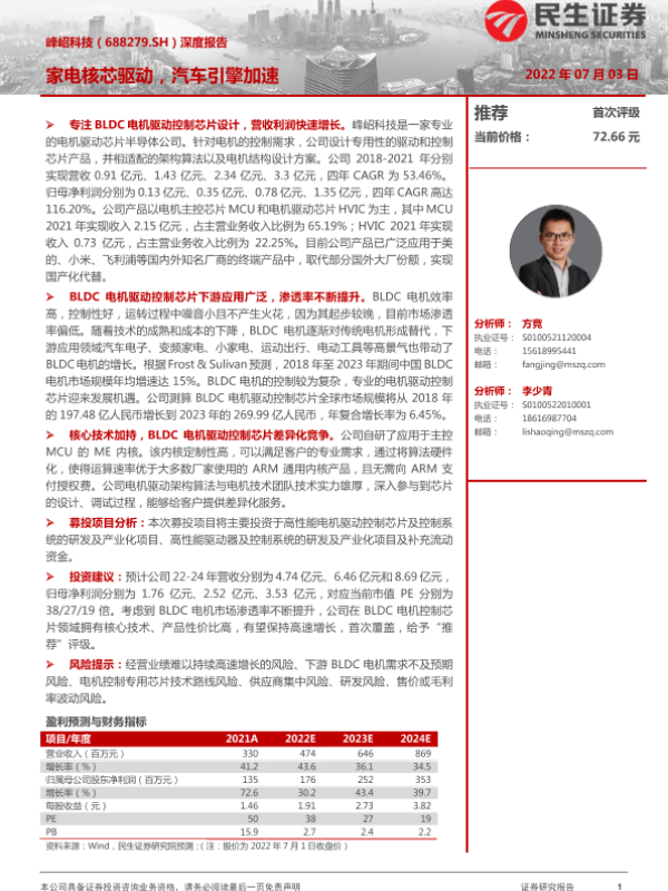 【民生证券】【20220703】峰岹科技-688279.SH-深度报告:家电核芯驱动,汽车引擎加速-42页 行业研究