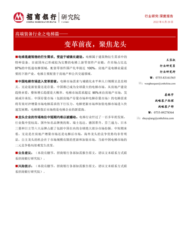 【招商银行】【20220629】高端装备行业之电梯篇:变革前夜,聚焦龙头-22页 行业研究