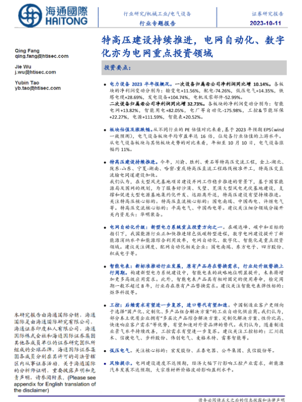 【海通国际】【20231011】2023-10-25-电气设备行业专题报告-特高压建设持续推进-电网自动化、数字化亦为电网重点投资领域-27页 行业研究