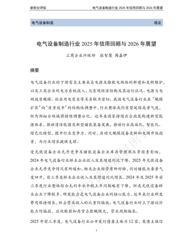 【新世纪评级】【2025】电气设备制造行业 2025年信用回顾与 2026年展望-60页 行业研究