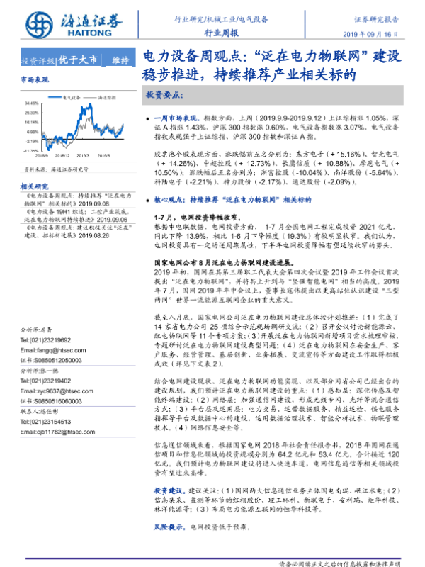 【海通证券】【20190916】电力设备周观点:“泛在电力物联网”建设稳步推进,持续推荐产业相关标的-4页 行业研究