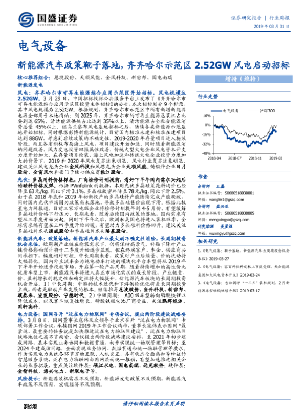 【国盛证券】【20190331】电气设备行业周报:新能源汽车政策靴子落地,齐齐哈尔示范区2.52GW风电启动招标-22页 行业研究