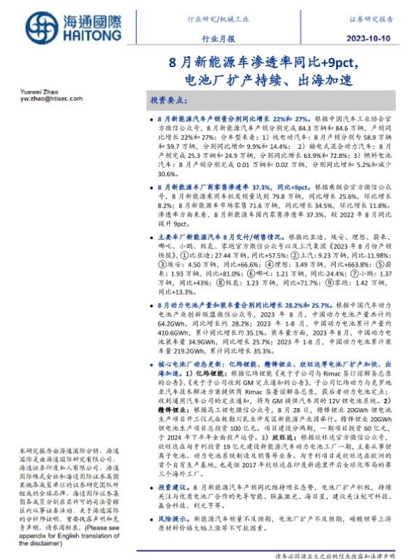 【海通国际】【20231010】8月新能源车渗透率同比+9pct,电池厂扩产持续、出海加速-10页 行业研究