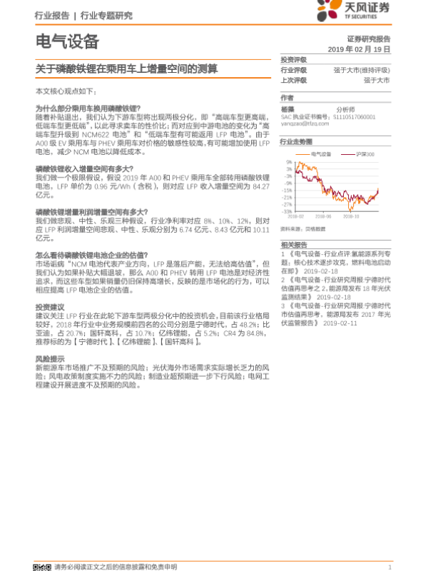 【天风证券】【20190219】关于磷酸铁锂在乘用车上增量空间的测算-6页 行业研究