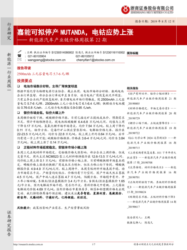 【浙商证券】【20190812】20190812-浙商证券-新能源汽车产业链价格周报第22期:嘉能可拟停产MUTANDA,电钴应势上涨-7页 行业研究