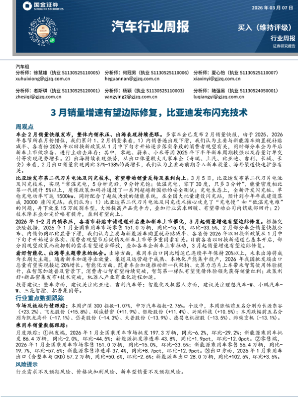 【国金证券】【202603】汽车行业周报:3月销量增速有望边际修复,比亚迪发布闪充技术-11页 证券期货研究报告