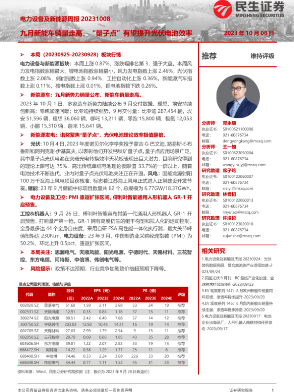 【民生证券】【20231008】电力设备及新能源周报:九月新能车销量走高,“量子点”有望提升光伏电池效率-26页 行业研究