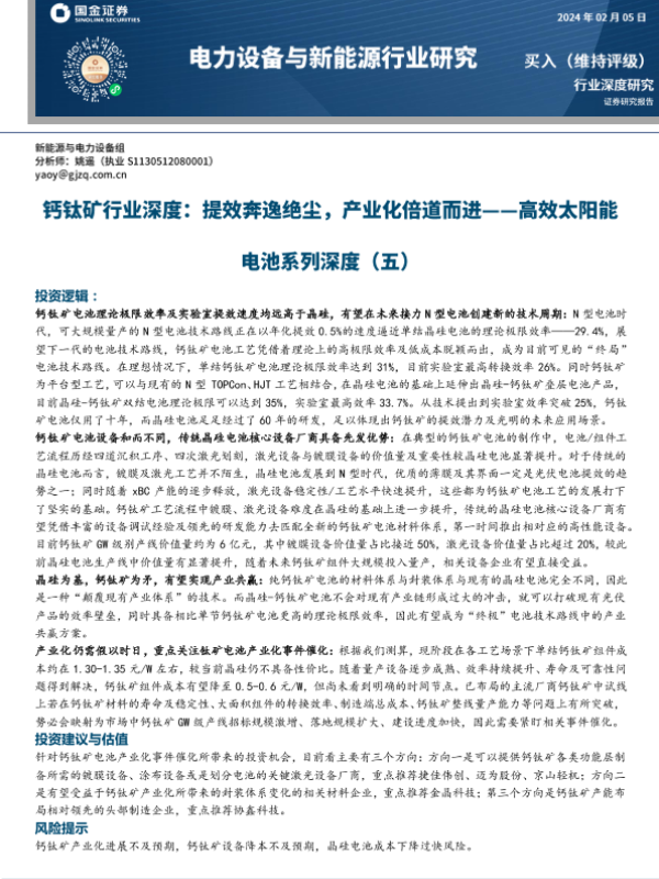 【国金证券】【20240205】钙钛矿行业深度:提效奔逸绝尘,产业化倍道而进-高效太阳能电池系列深度(五)-31页 行业研究