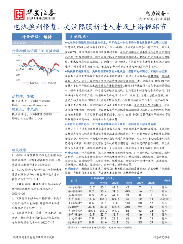 【华安证券】【20220827】电力设备行业周报:电池盈利修复,关注隔膜新进入者及上游锂环节-23页 行业研究