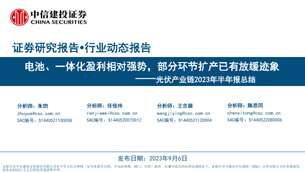 【中信建投证券】【20230906】光伏行业产业链2023年半年报总结:电池、一体化盈利相对强势,部分环节扩产已有放缓迹象-59页 行业研究