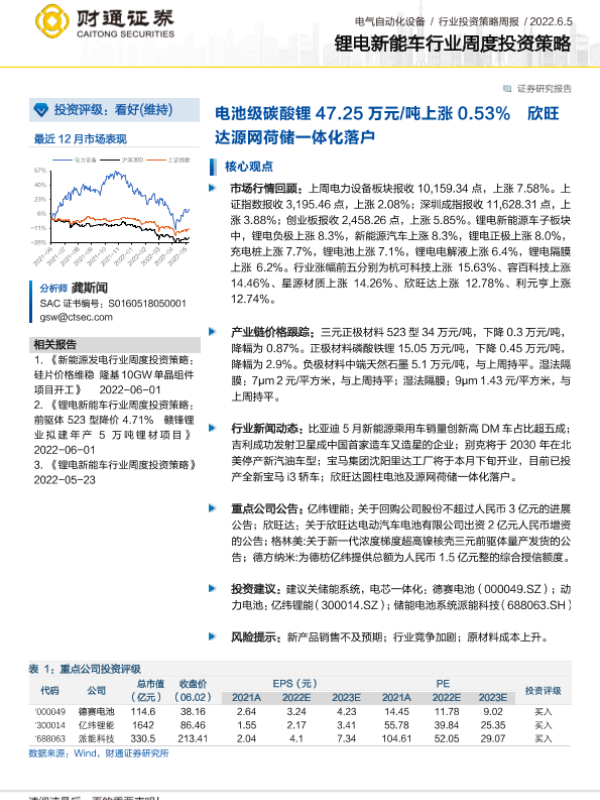 【财通证券】【20220605】20220605-财通证券-锂电新能车行业周度投资策略:电池级碳酸锂47.25万元 吨上涨0.53% 欣旺达源网荷储一体化落户-19页 行业研究