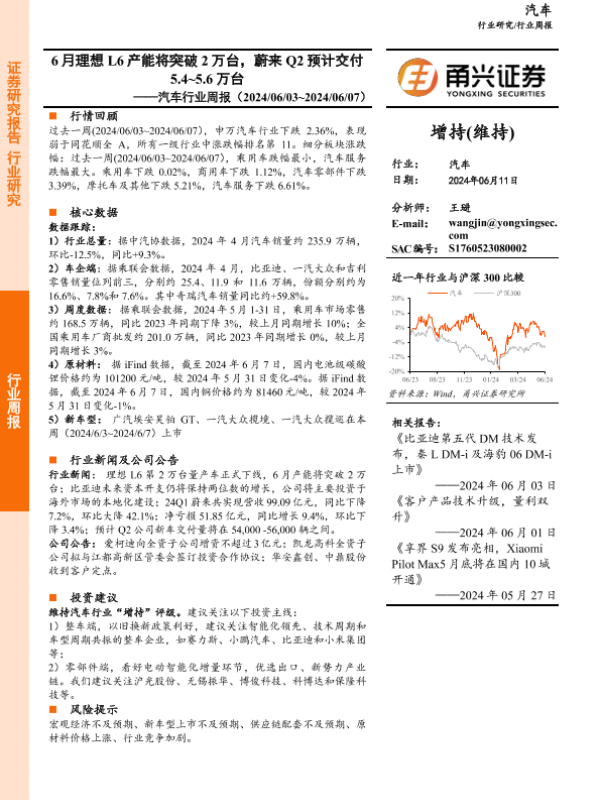 【甬兴证券】【20240611】20240611-甬兴证券-汽车行业周报:6月理想L6产能将突破2万台,蔚来Q2预计交付5.4~5.6万台-13页 行业研究