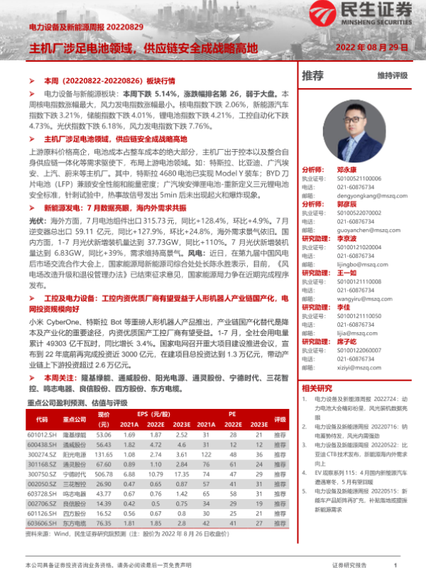 【民生证券】【20220829】电力设备及新能源周报:主机厂涉足电池领域,供应链安全成战略高地-34页 行业研究