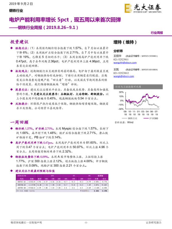 【光大证券】【20190902】20190902-光大证券-钢铁行业周报:电炉产能利用率增长5pct,现五周以来首次回弹-8页 行业研究