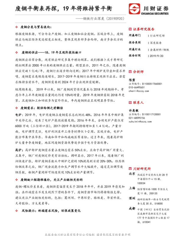 【川财证券】【20190920】废钢平衡表再探,19年将维持紧平衡-17页 行业研究