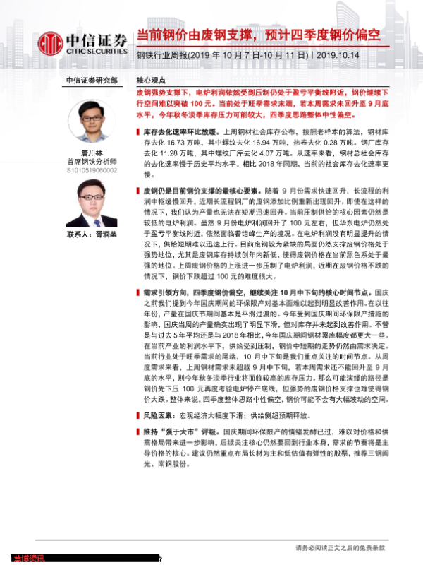 【中信证券】【20191014】20191014-中信证券-钢铁行业周报:当前钢价由废钢支撑,预计四季度钢价偏空-12页 行业研究