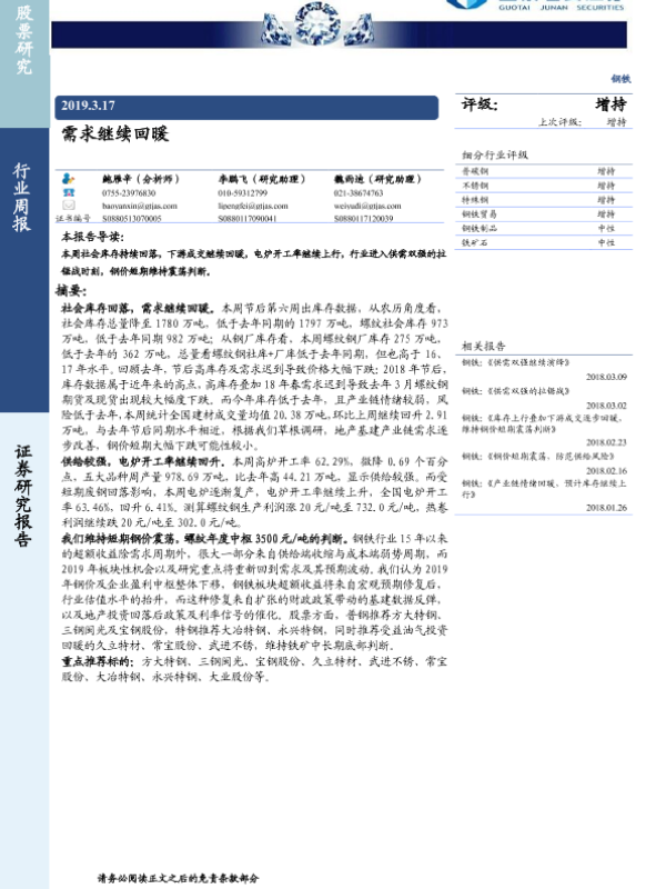 【国泰君安证券】【20190317】20190317-国泰君安-钢铁行业周报:需求继续回暖-22页 行业研究