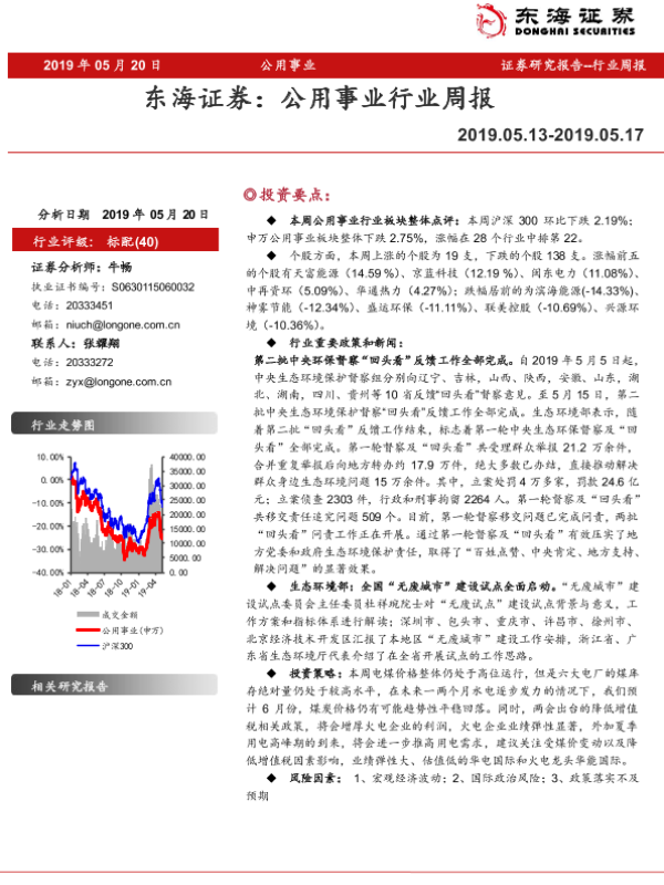 【东海证券】【20190520】公用事业行业周报-6页 行业研究