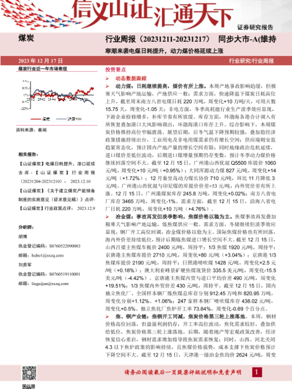 【山西证券】【20231217】煤炭行业周报:寒潮来袭电煤日耗提升,动力煤价格延续上涨-19页 行业研究