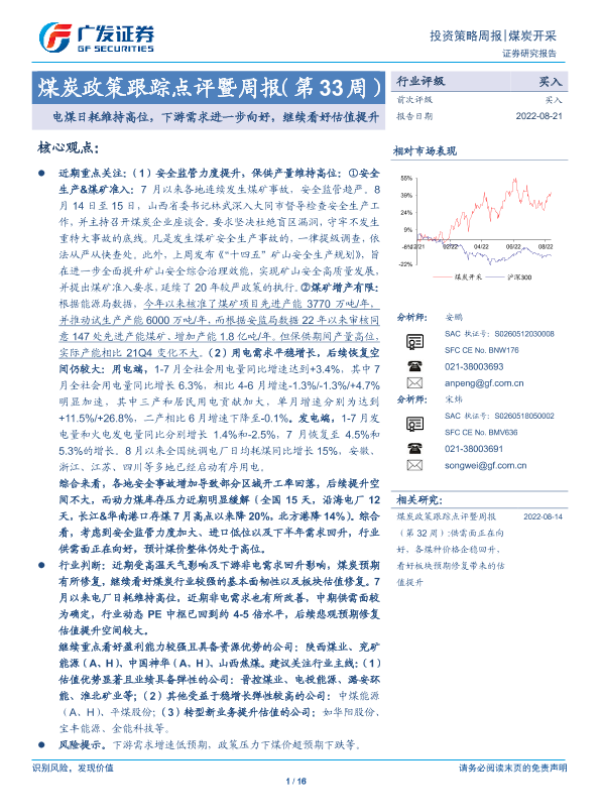 【广发证券】【20220821】煤炭开采:煤炭政策跟踪点评暨周报(第33周)-电煤日耗维持高位,下游需求进一步向好,继续看好估值提升-16页 行业研究