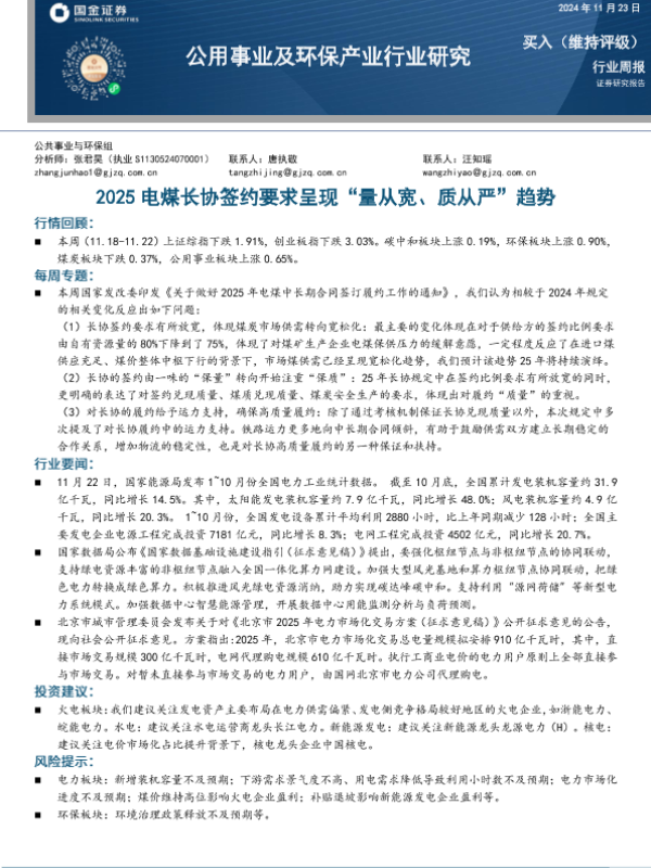 【国金证券】【20241123】2025电煤长协签约要求呈现“量从宽、质从严”趋势-15页 行业研究