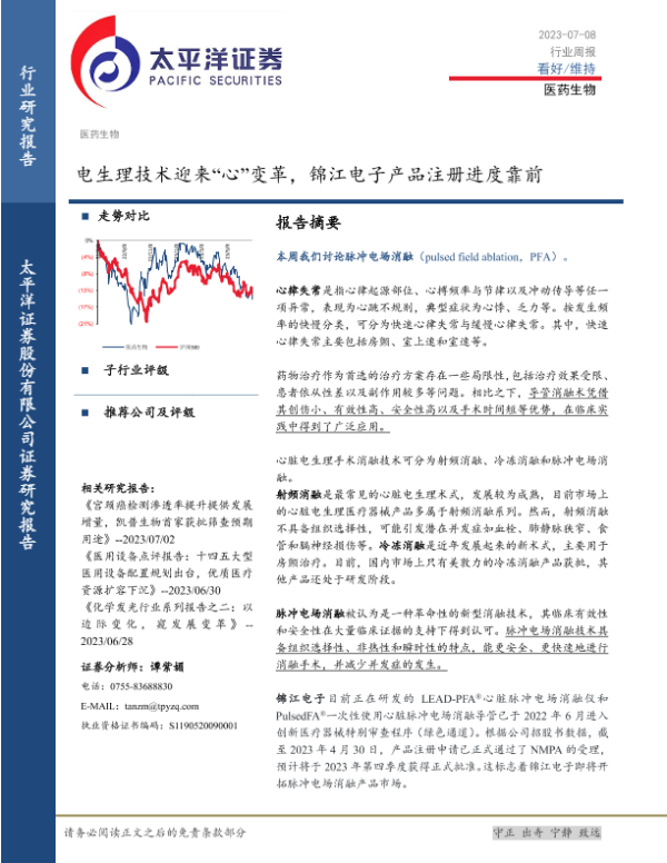 【太平洋证券】【20230708】医药生物行业周报:电生理技术迎来“心”变革,锦江电子产品注册进度靠前-23页 行业研究