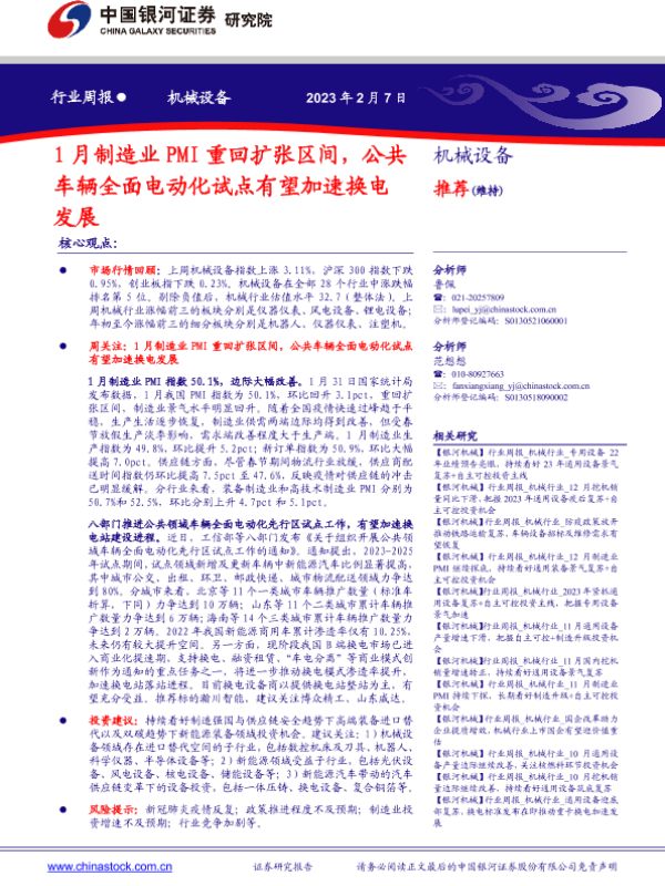 【银河证券】【20230207】20230207-中国银河-机械设备行业周报:1月制造业PMI重回扩张区间,公共车辆全面电动化试点有望加速换电发展-21页 行业研究