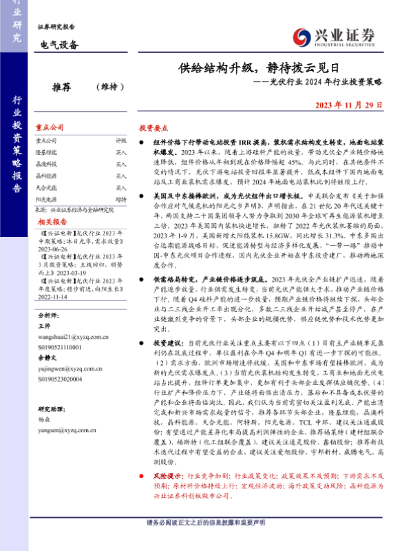 【兴业证券】【20231129】供给结构升级,静待拨云见日——光伏行业2024年行业投资策略-44页 行业研究