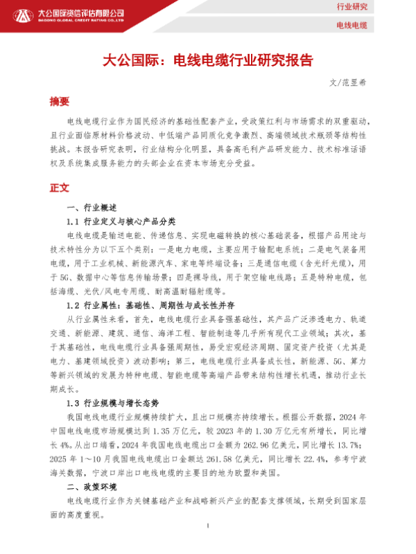 【大公国际】【2024】电线电缆行业研究报告-9页 行业研究